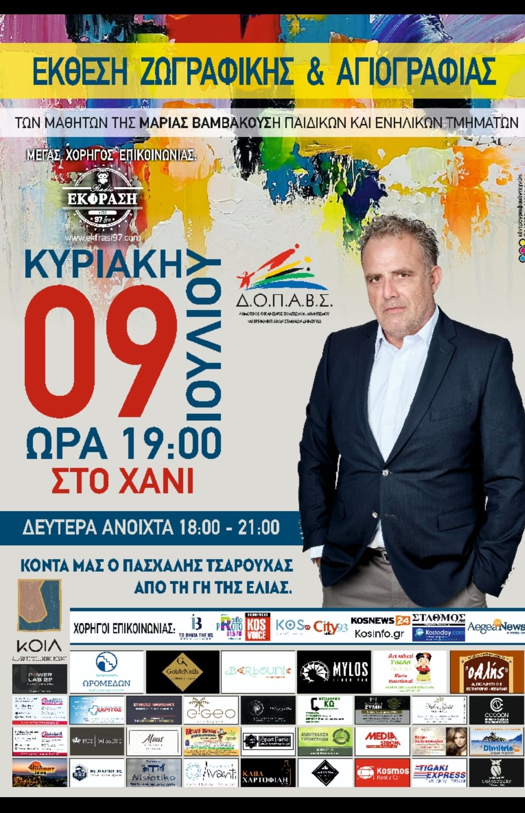 Τα εγκαίνια της έκθεσης θα γίνουν την Κυριακή 9 Ιουλίου στις 7 το βραδύ παρουσία του δημοφιλούς ηθοποιού από τη Γη της Ελιάς Πασχάλη Τσαρούχα.
