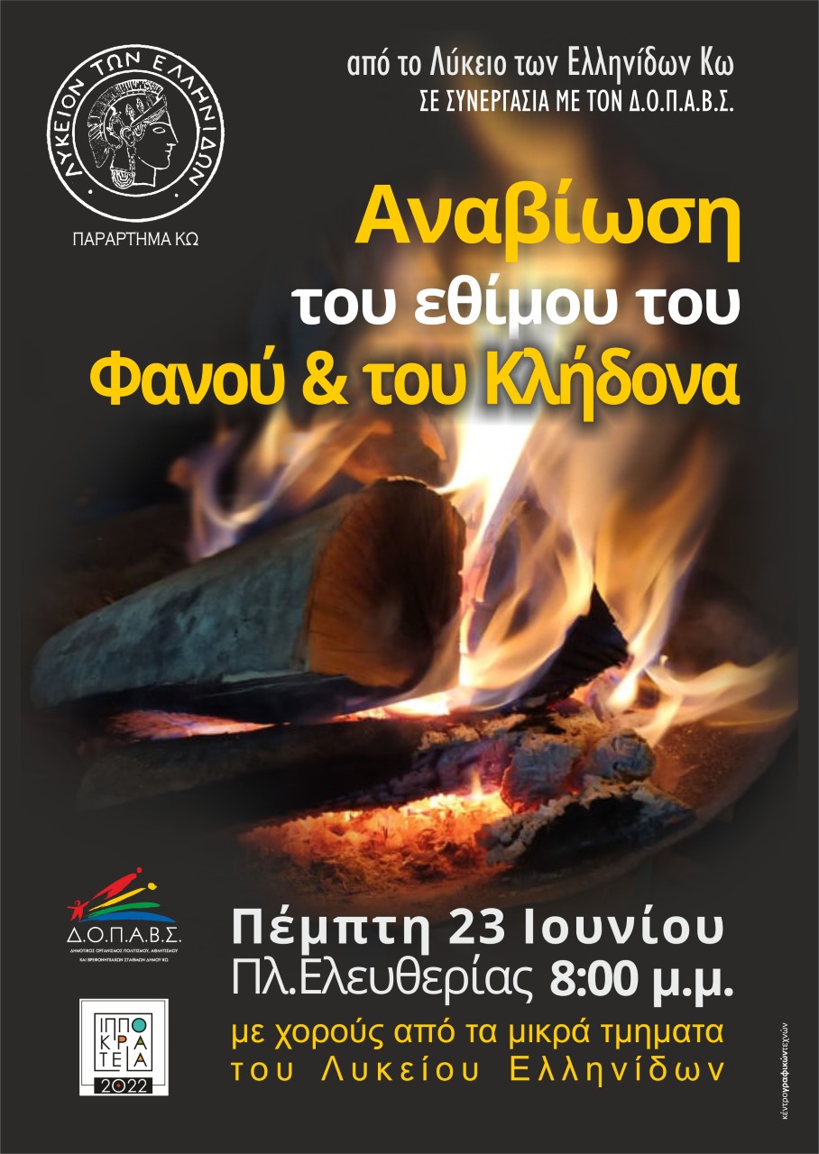 Το Λύκειο Ελληνίδων –Παράρτημα Κω με την στήριξη του ΔΟΠΑΒΣ παρουσιάζει την Αναβίωση του Εθίμου του Φανού και του Κλήδονα την Πέμπτη 23 Ιουνίου 2022 και ώρα 20:00 στην Πλατεία Ελευθερίας.