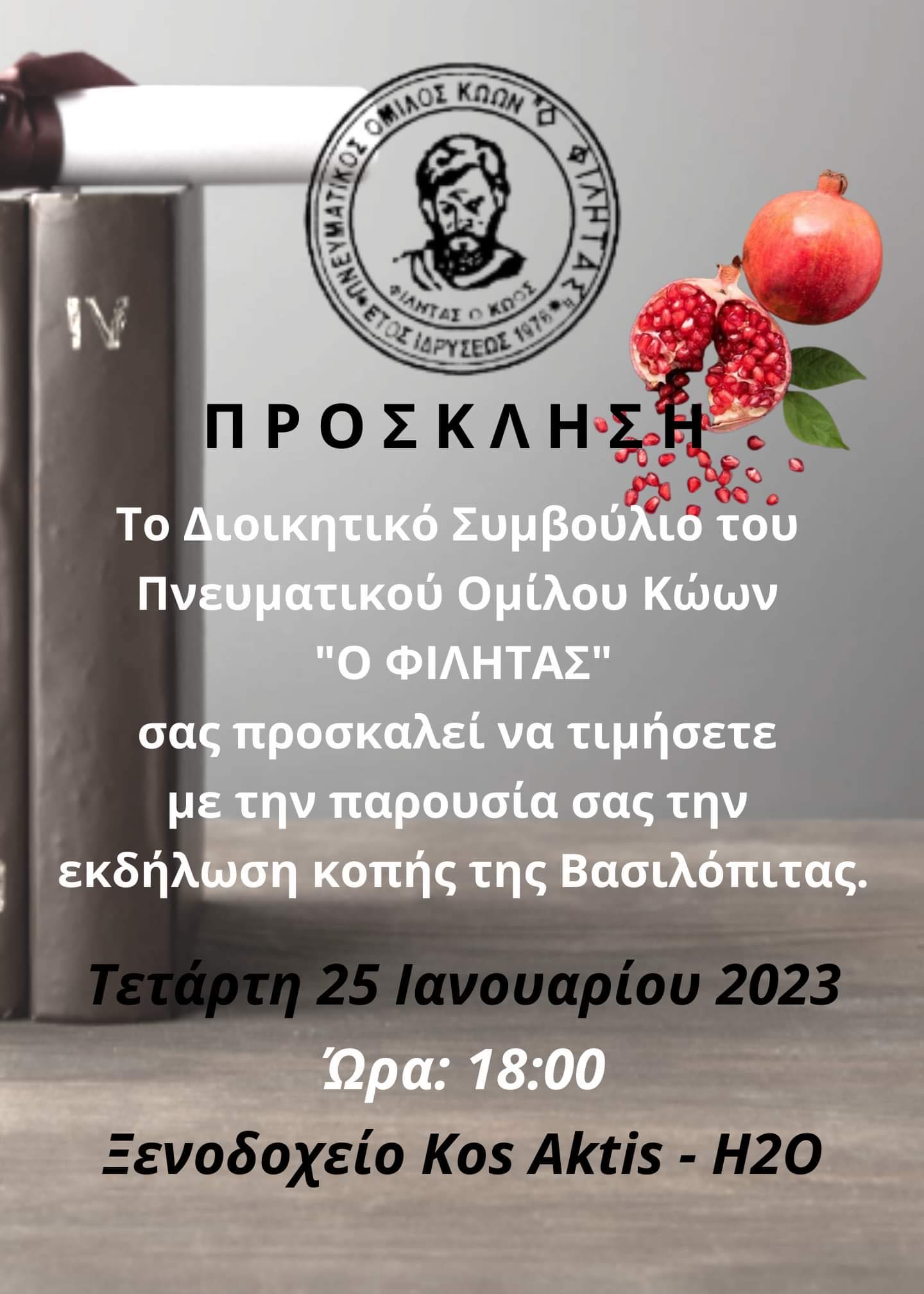 Tο Διοικητικό Συμβούλιο του Π.Ο.ΚΩΩΝ "Ο ΦΙΛΗΤΑΣ" σας προσκαλεί να τιμήσετε με την παρουσία σας την εκδήλωση κοπής της Βασιλόπιτας,