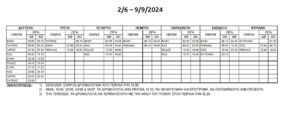 Αναλυτικότερα, θα εκτελεί εβδομαδιαίως ένα δρομολόγιο με αναχώρηση από Πειραιά κάθε Κυριακή στις 6.00 το απόγευμα για Βαθύ Σάμου-Πάτμος–Λέρος-Κως Σύμη-Ρόδος με επιστροφή.