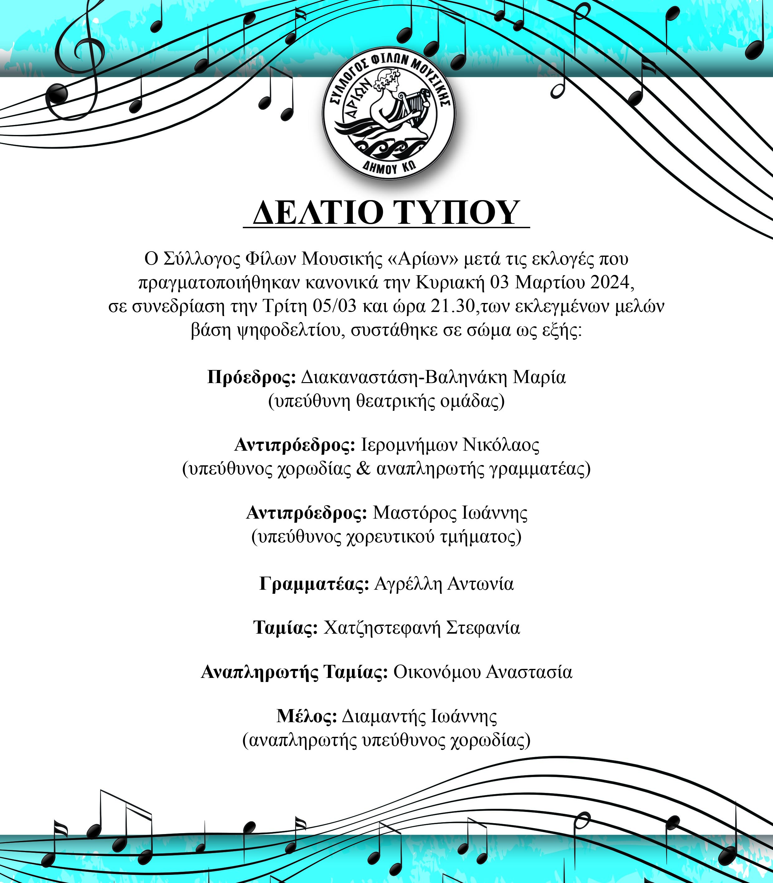 TΟ ΝΕΟ Δ.Σ. ΤΟΥ Σ/ΓΟΥ ΦΙΛΩΝ ΜΟΥΣΙΚΗΣ "ΑΡΙΩΝ"