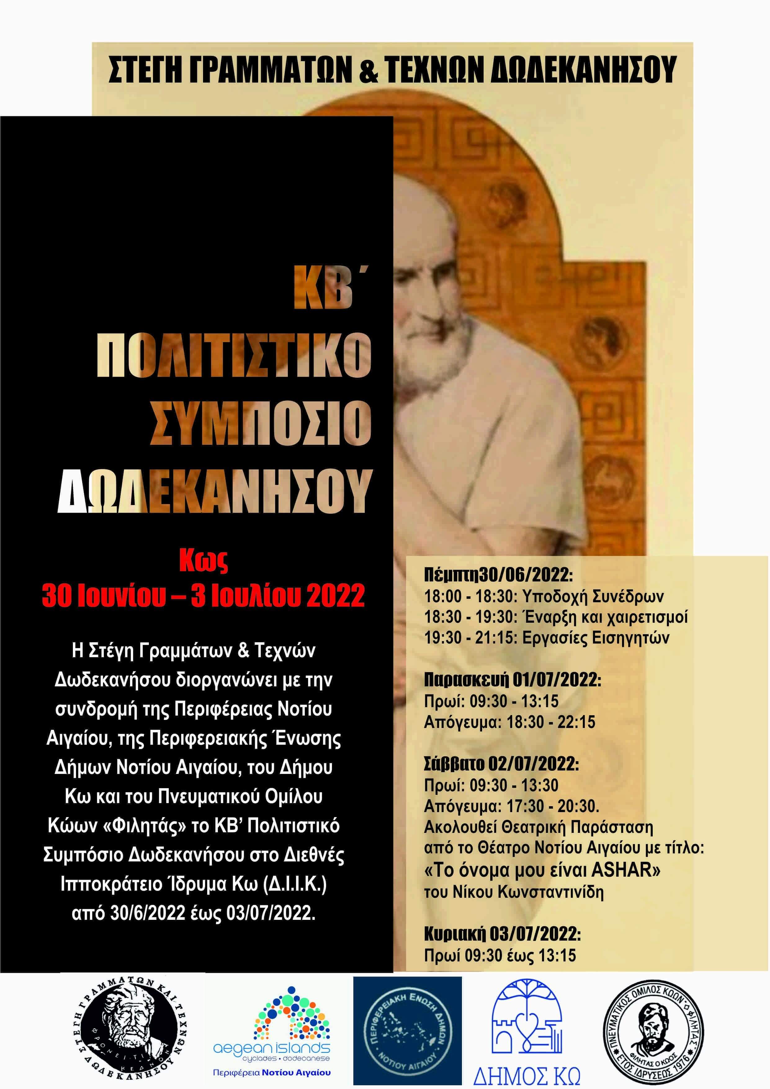 Η Στέγη Γραμμάτων & Τεχνών Δωδεκανήσου διοργανώνει με την συνδρομή της Περιφέρειας Νοτίου Αιγαίου, της Περιφερειακής Ένωσης Δήμων Νοτίου Αιγαίου, του Δήμου Κω και του Πνευματικού Ομίλου Κώων «Φιλητάς» το ΚΒ' Πολιτιστικό Συμπόσιο Δωδεκανήσου στο Διεθνές Ιπποκράτειο Ίδρυμα Κω (Δ.Ι.Ι.Κ.) από 30/6/2022 έως 03/07/2022.