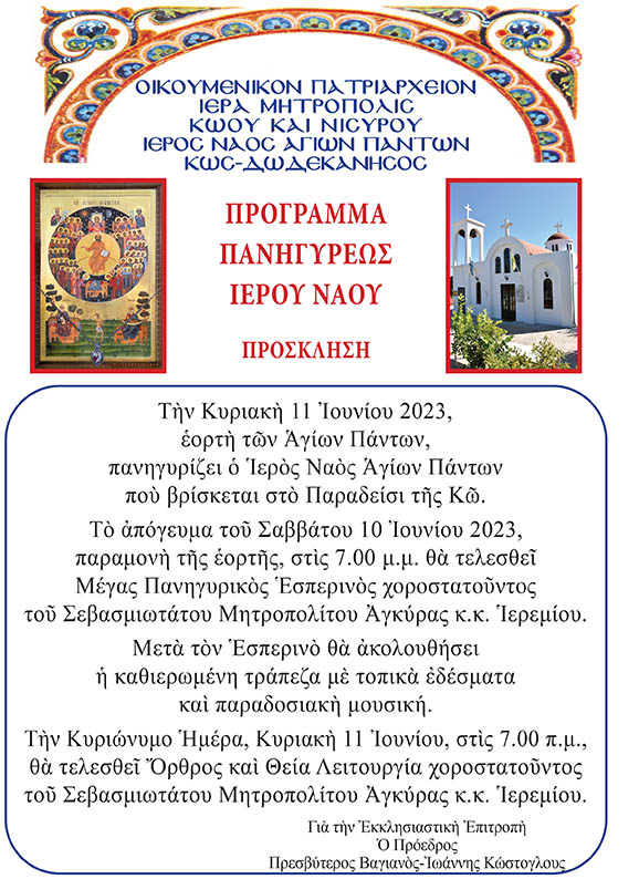To πρόγραμμα εορτασμού του Ι.Ν. Αγ. Πάντων στην Κω