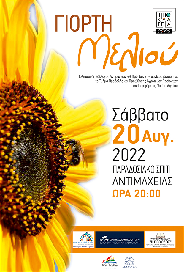 Το Τμήμα Προβολής και Προώθησης Αγροτικών Προϊόντων της Περιφέρειας Νοτίου Αιγαίου, ο Πολιτιστικός Σύλλογος Αντιμάχειας «Η Πρόοδος», η Κοινότητα Αντιμάχειας και ο ΔΟΠΑΒΣ στα πλαίσια των Θερινών Ιπποκρατείων 2022 διοργανώνουν την Γιορτή Μελιού το Σάββατο 20 Αυγούστου 2022 στις 20:00 στο Παραδοσιακό σπίτι Αντιμάχειας.
