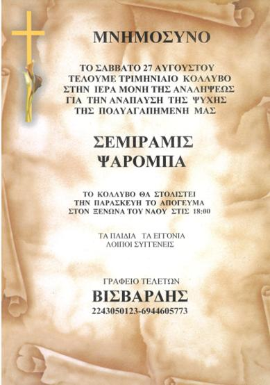 Το Σάββατο 27 Αυγούστου 2022 το πρωί,  θα τελεστεί μνημόσυνο στην Ιερά Μονή της Αναλήψεως στην Κάλυμνο, υπέρ αναπαύσεως της ψυχής της Σεμίραμις Ψαρομπά με τη συμπλήρωση τριών μηνών από την εκδημία της.