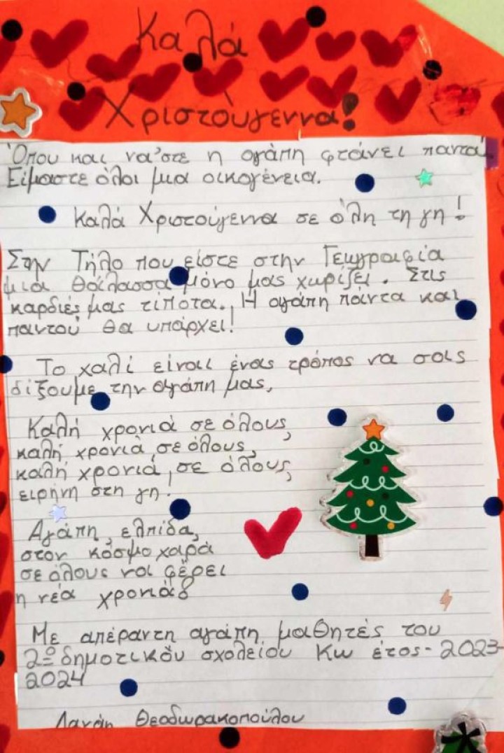 Μάλιστα, όπως εξηγεί η κα Αμπατζίδου, σε επικοινωνία που είχε με μία από τις δασκάλες του σχολείου της Τήλου, τη Βασιλεία Ψυχογυιού, κανονίστηκε τις επόμενες μέρες να γίνει και μία διαδικτυακή συνάντηση, έτσι ώστε οι μαθητές μας να γνωριστούν και να ανταλλάξουν ευχές. Ακριβώς, όπως έγινε τις περασμένες χρονιές με τον Σάββα και τον Άγγελο από την Τέλενδο και τους Αρκιούς αντίστοιχα.