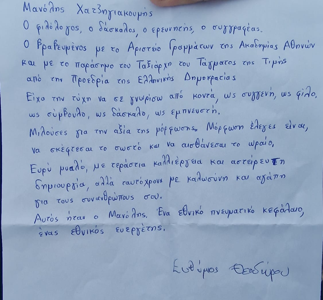 Ο Σεβασμιώτατος αναφέρθηκε στο σπουδαίο έργο του μεγάλου Κώου δασκάλου, ενώ ακολούθησε οι συγκινητικοί αποχαιρετισμοί από τον μαθητή και συγγενή του εκλιπόντος Μάκη Β. Θεοδώρου και από την Πρόεδρο του Πνευματικού Ομίλου Κώων «ο Φλητάς» Μαρία Τουλαντά-Παρισίδου, η οποία επέδωσε τιμητική πλακέτα στους συγγενείς του εκλιπόντος και δεσμεύθηκε για την πραγματοποίηση εκδήλωσης στη μνήμη του μιας και για λόγους ανωτέρας βίας είχε αναβληθεί η προγραμματισμένη για το 2023 εκδήλωση- αφιέρωμα στο έργο του.