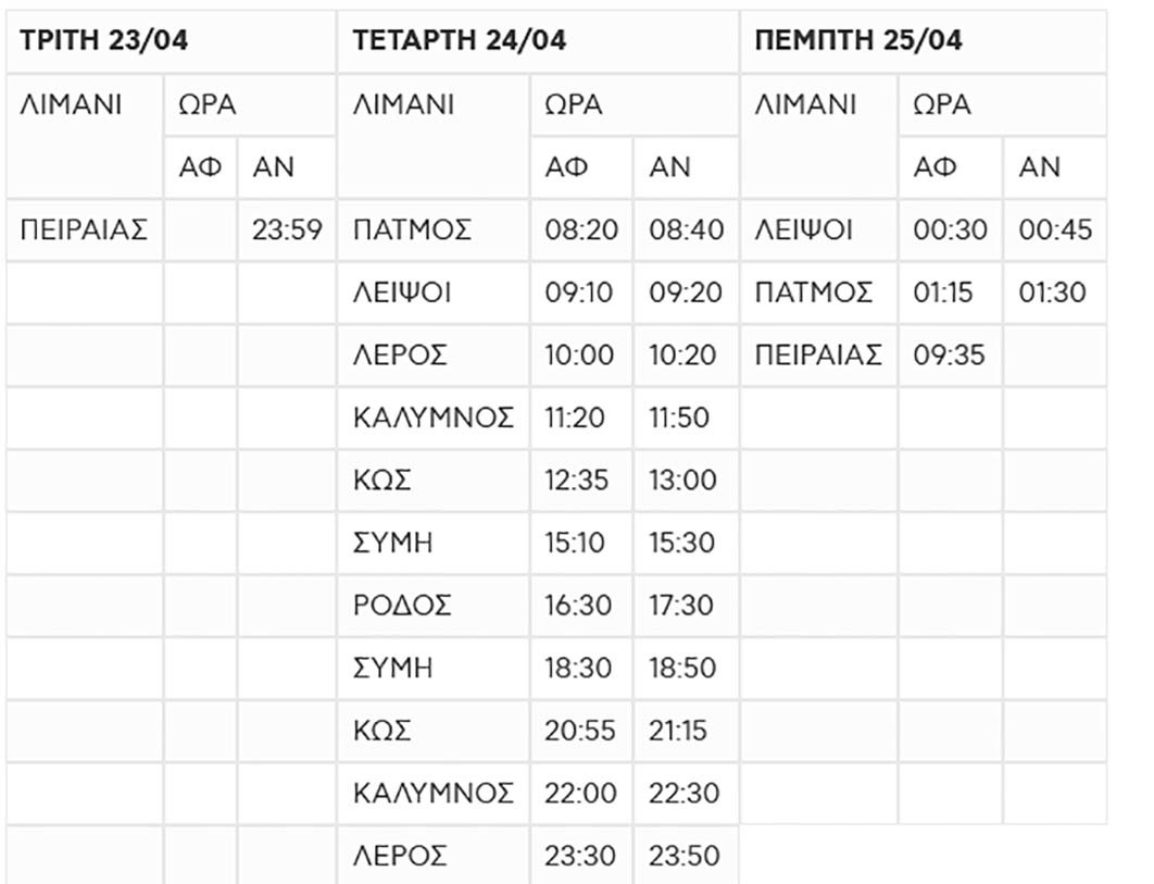 Το πλοίο θα αναχωρήσει από Πειραιά την 23:59 (αντί 15:00) ως ακολούθως και κατόπιν ως εγκεκριμένα.