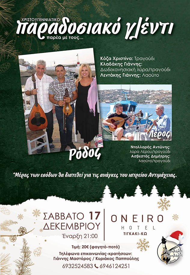Το Σάββατο 17 Δεκεμβρίου 2022 διοργανώνεται παραδοσιακό γλέντι με εξαίρετους φίλους καλλιτέχνες από την Ρόδο και την Λέρο.Στην αίθουσα του ξενοδοχείου "ΌΝΕΙΡΟ" στο Τιγκάκι.