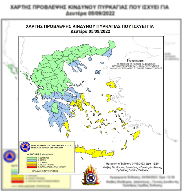 Σύμφωνα με το Χάρτη Πρόβλεψης Κινδύνου Πυρκαγιάς που εκδίδει η Γενική Γραμματεία Πολιτικής Προστασίας του Υπουργείου Εσωτερικών και Διοικητικής Ανασυγκρότησης, για αύριο Δευτέρα 5 Σεπτεμβρίου, προβλέπεται υψηλός κίνδυνος πυρκαγιάς (κατηγορία κινδύνου 3) στις εξής περιοχές:
